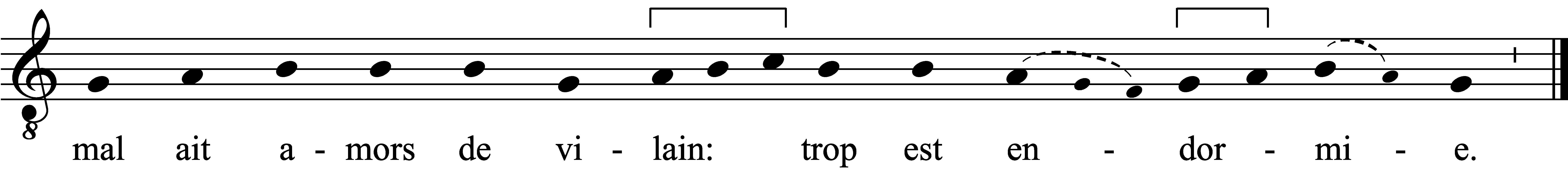 - mal ait amors de vilain: trop est endormie. (st. II, final refrain)
