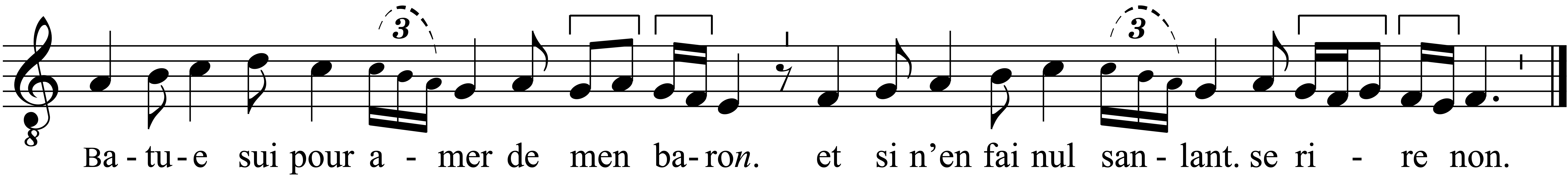 vdB 214: Batue sui pour amer de men baron et si n’en fai nul senlant se rire non. (Refrain)